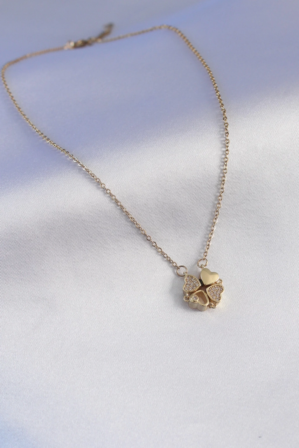 316L Çelik Gold Renk Açılır Yonca Model Zirkon Taşlı Kadın Kolye - TJ-BKO7292