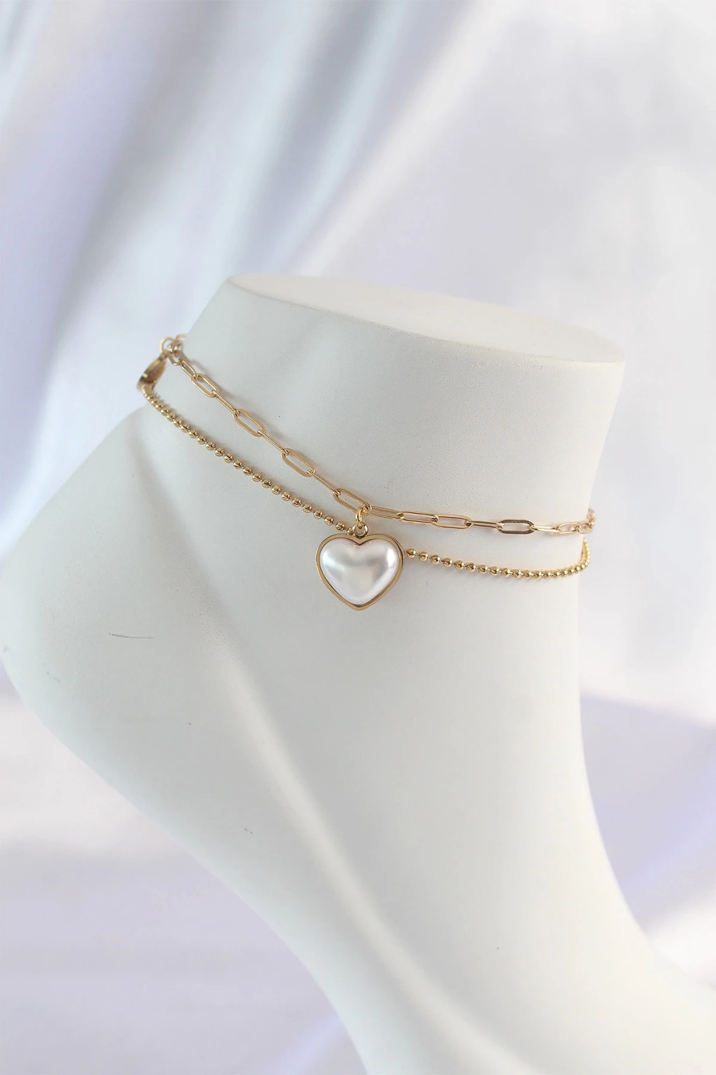 316L Çelik Gold Renk Beyaz Kalpli 2li Halhal - TJ-HH1584