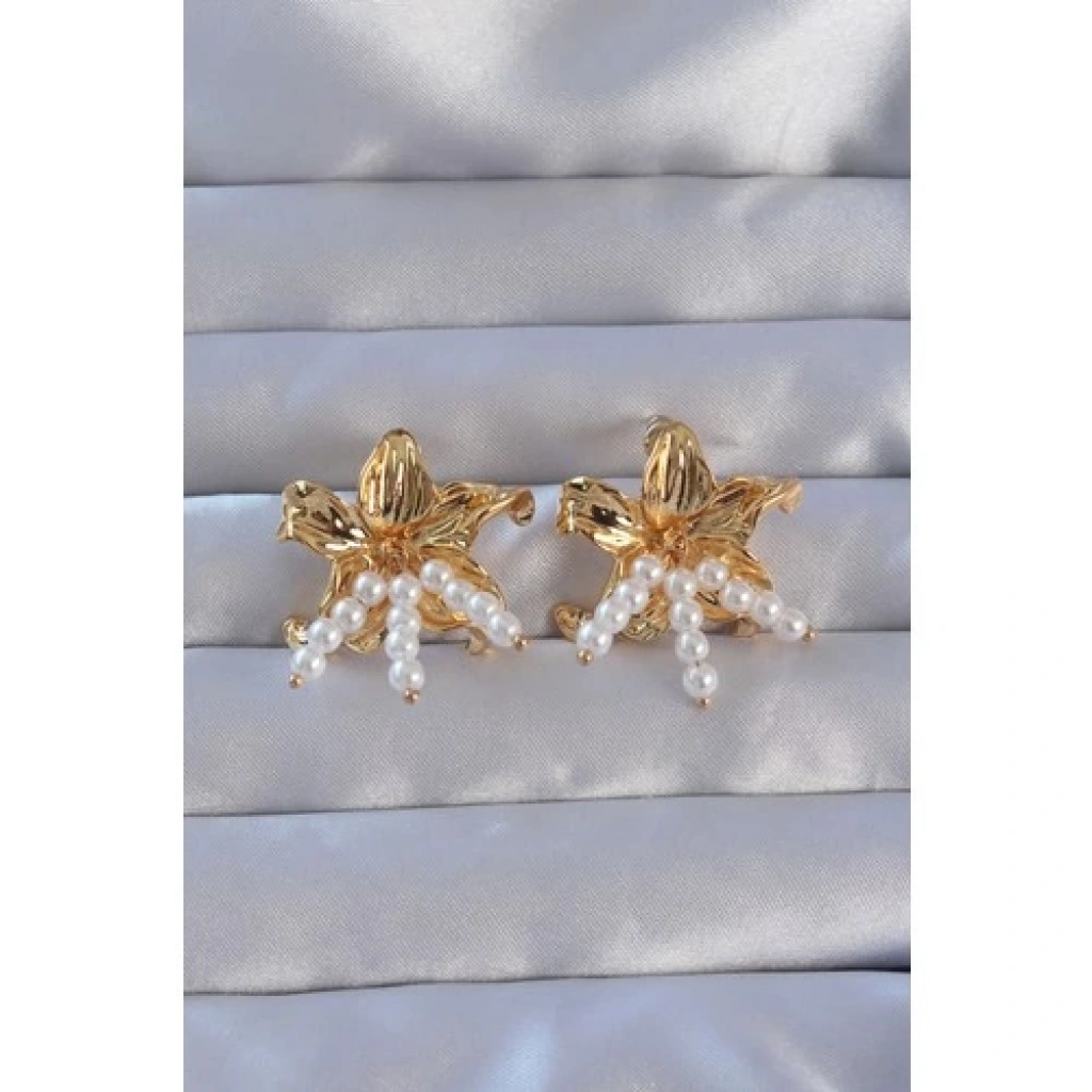 316L Çelik Gold Renk Inci Aksesuarlı Çiçek Model Küpe - TJ-BKP9108