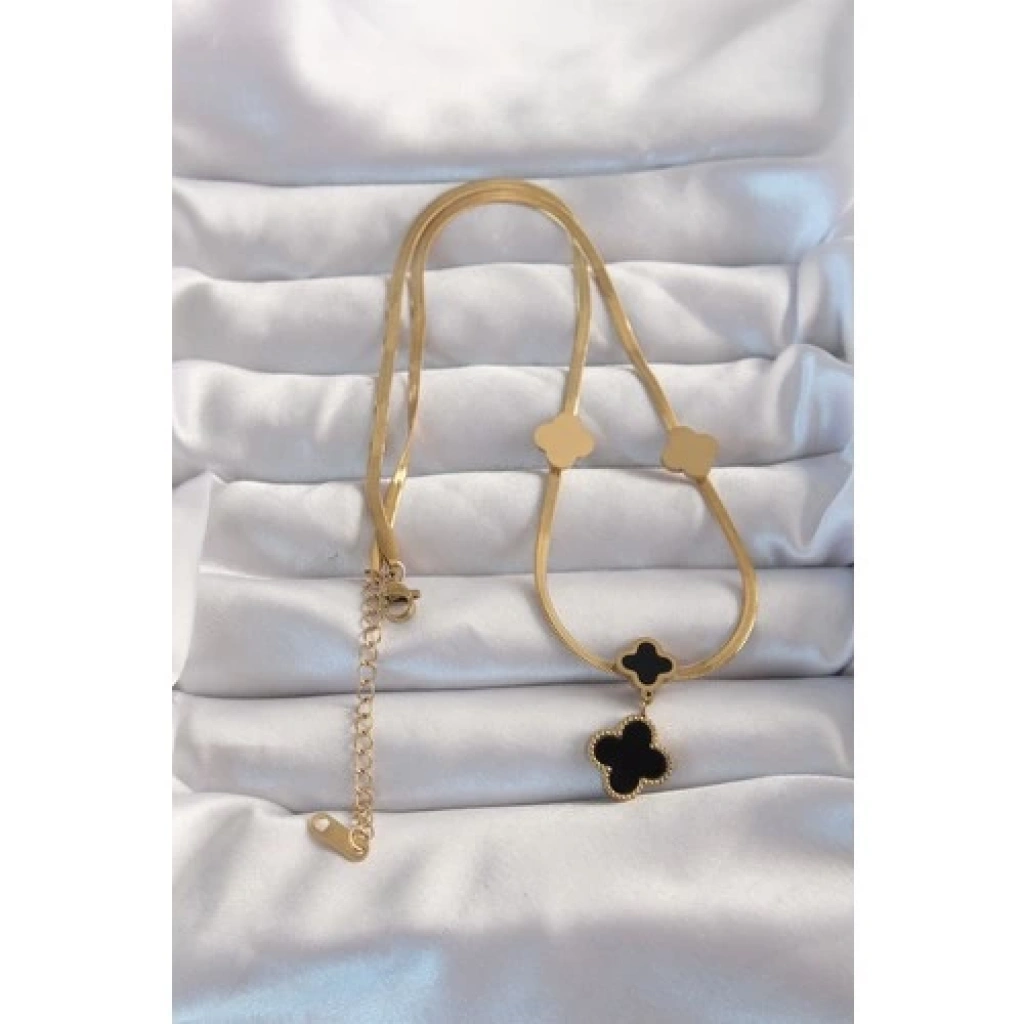 316L Çelik Gold Renk Italyan Zincirli Mineli Yonca Kolye - TJ-BKO8969