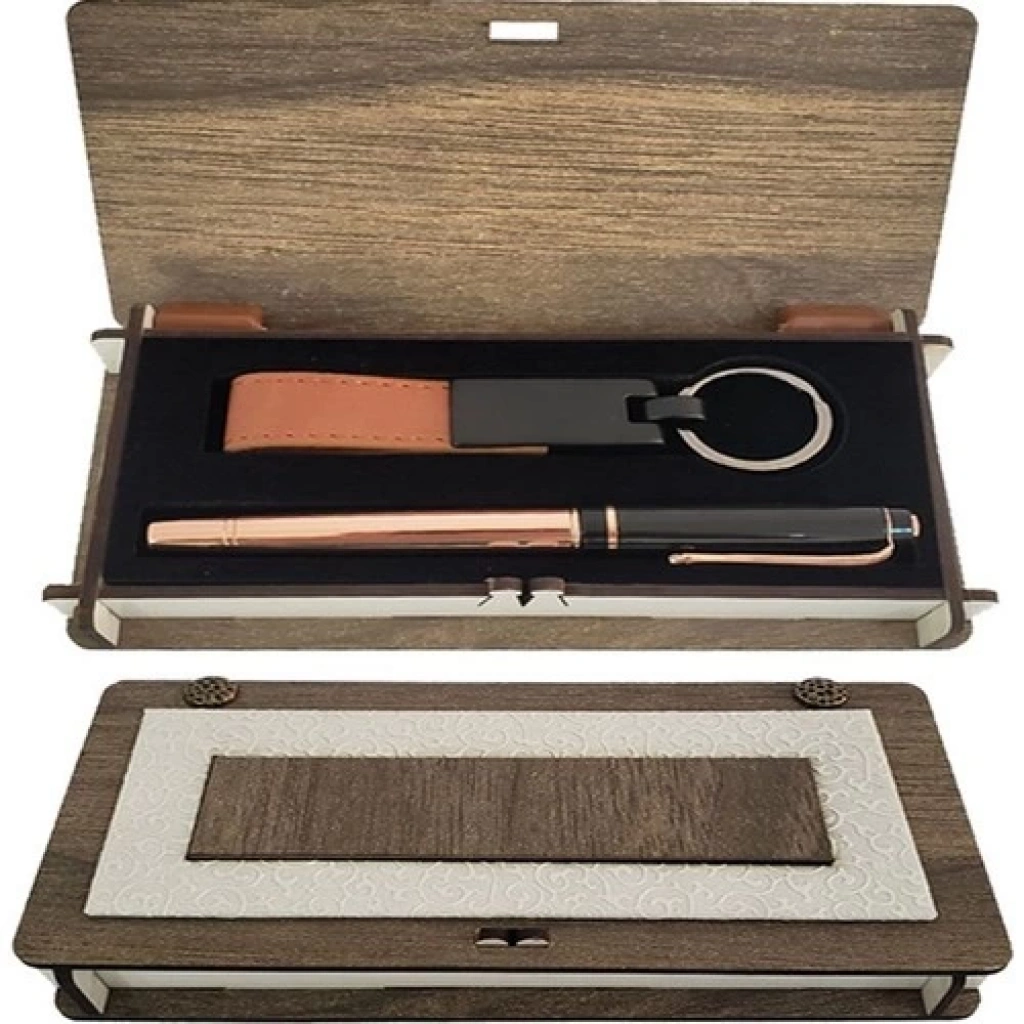 Ahşap Kutulu Set Bakır Roller Kalem ve Anahtarlık