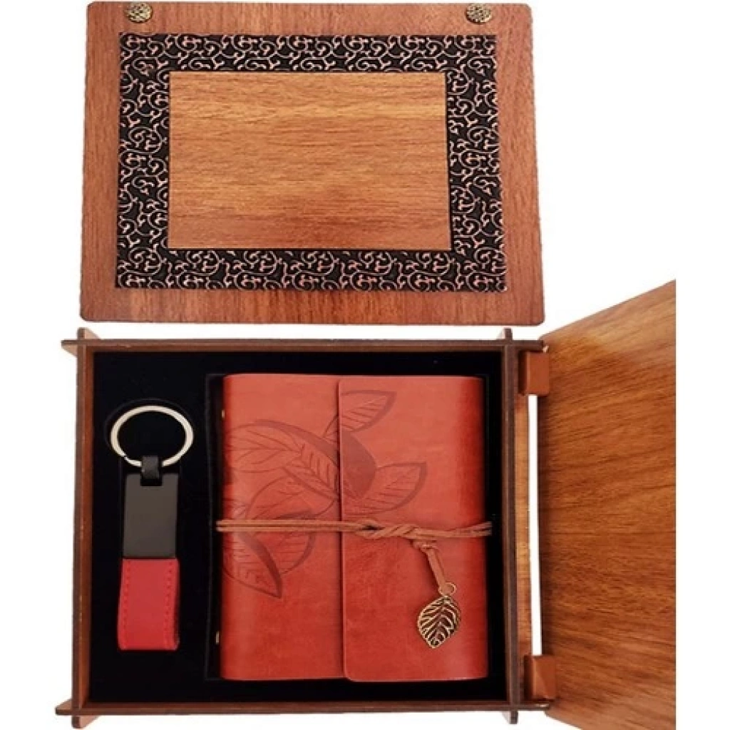 Ahşap Kutulu Kahve Deri Defter ve Anahtarlık Set