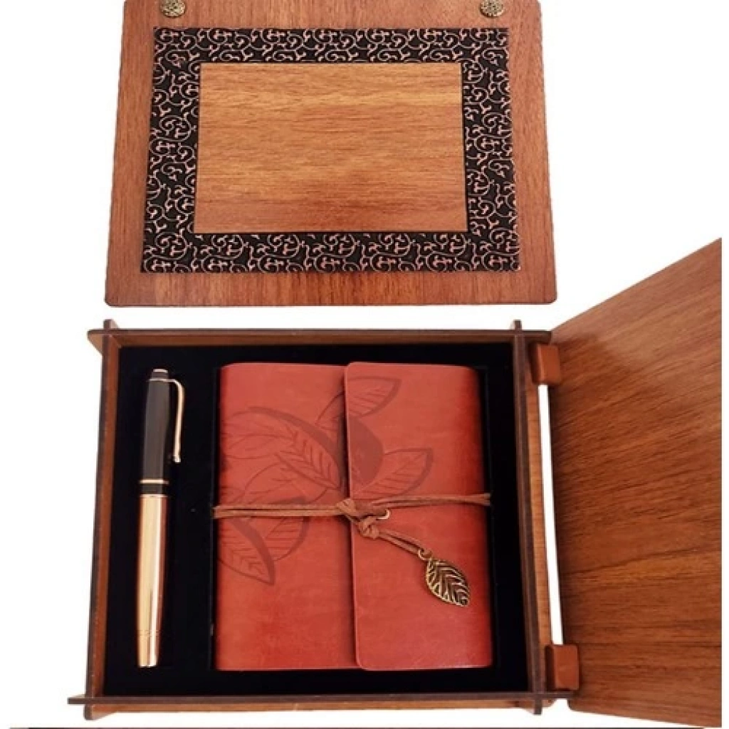 Ahşap Kutulu Kahve Deri Defter ve Metal Bakır Kalem