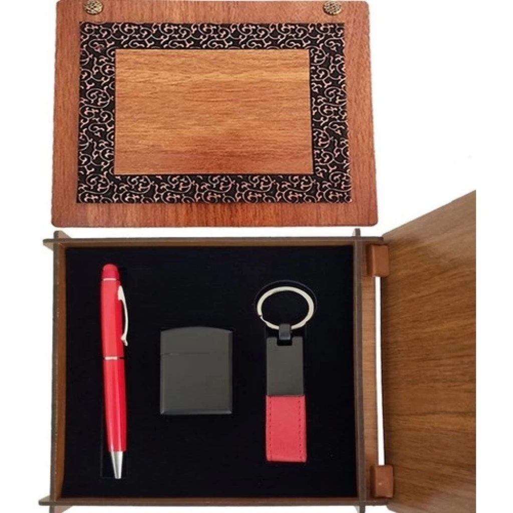 Ahşap Kutulu Kırmızı Kalem Anahtarlık ve Çakmak Set