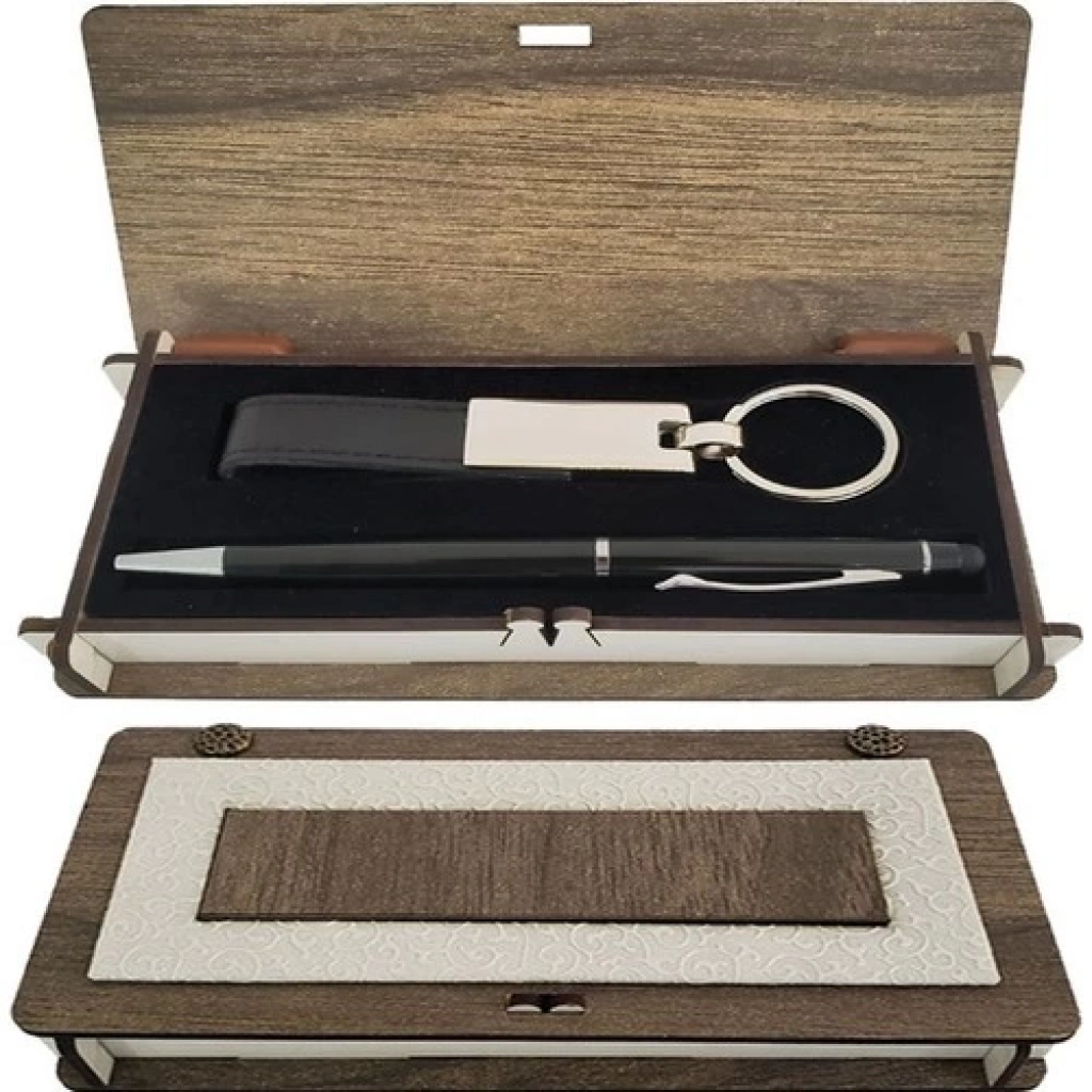 Ahşap Kutulu Siyah Anahtarlık ve Kalem Set