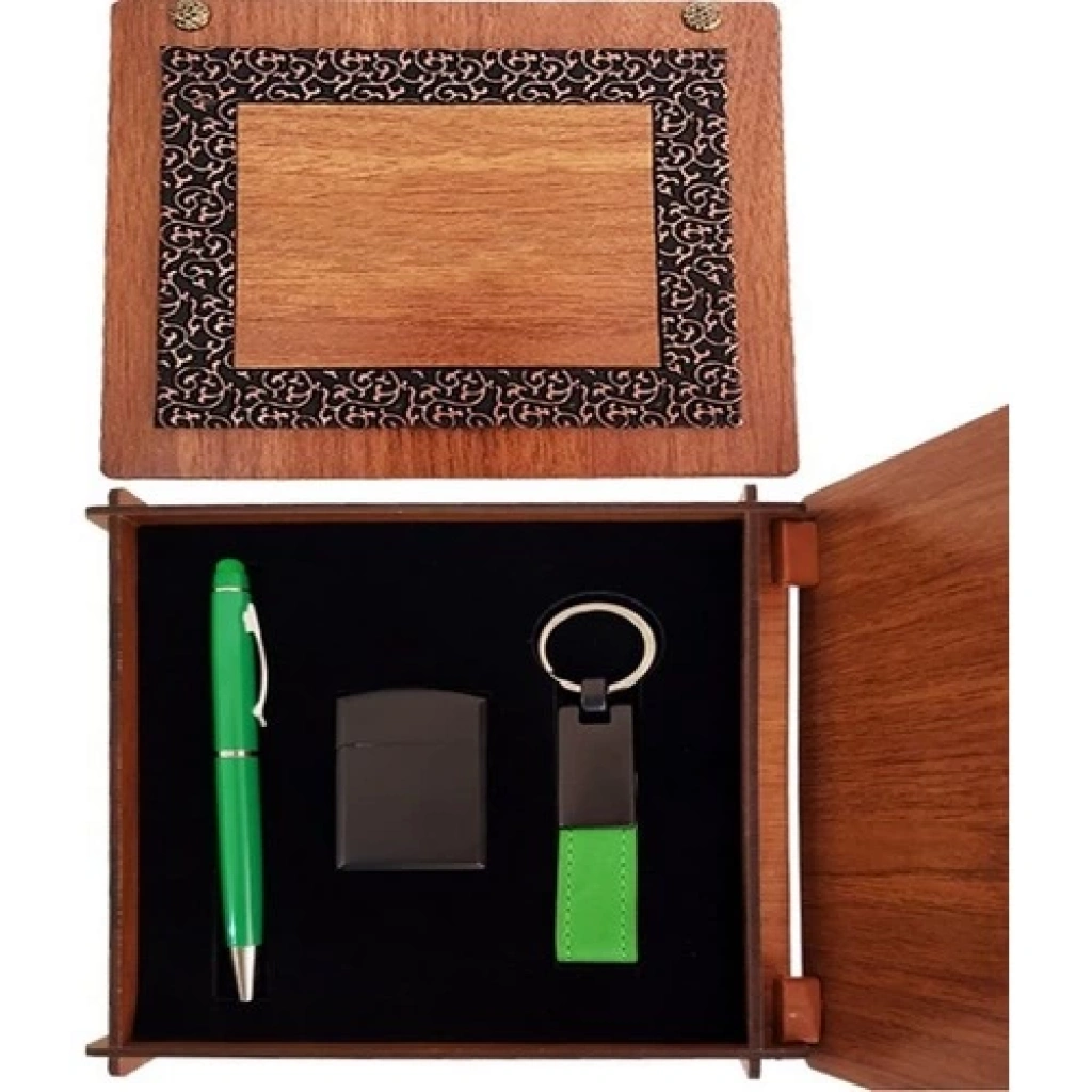Ahşap Kutulu Yeşil Kalem Anahtarlık ve Çakmak Seti