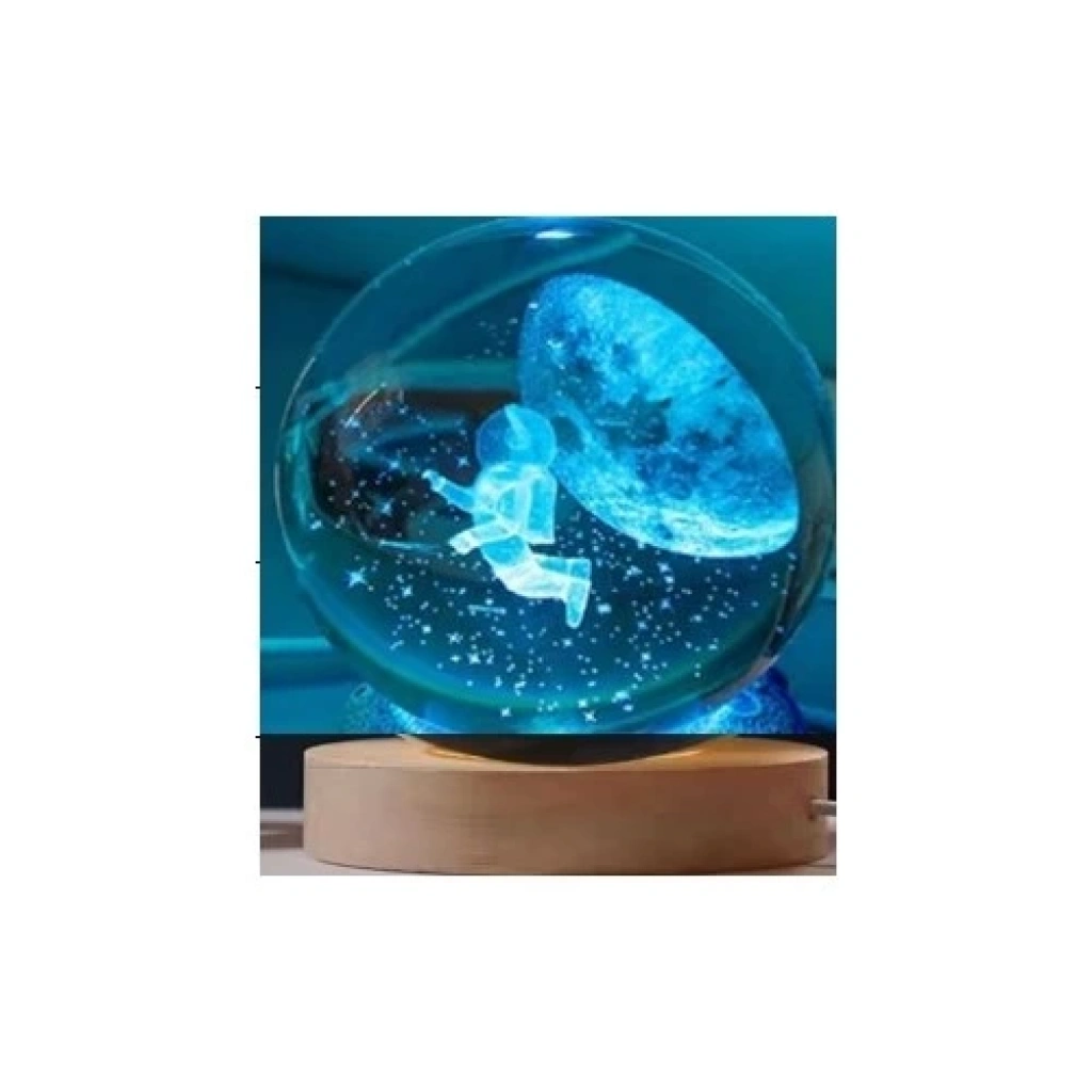 Dekoratif Uçan Astronot Tasarımlı Ahşap Altlıklı Işıklı Cam Küre Büyük Boy Cam:8cm Ahşap:2cm