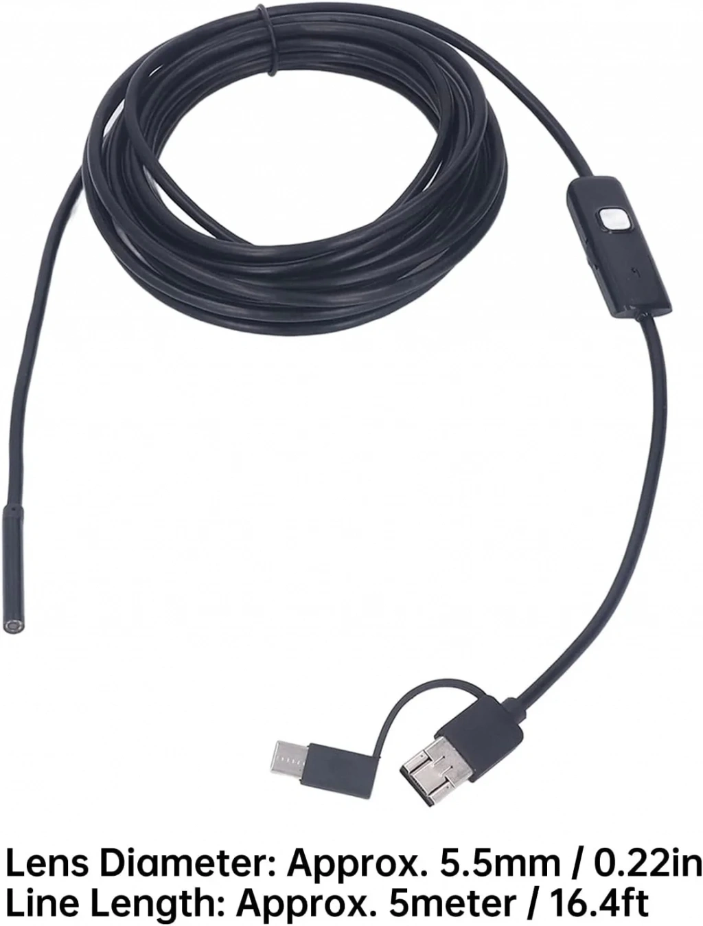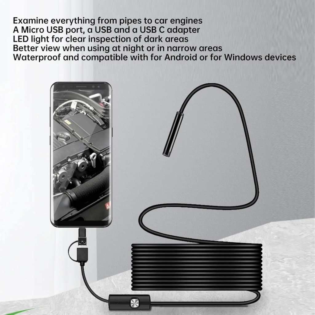 5 metrelik yılan kamerası 480P değişebilme özelliğine sahip olup, android cihazlara kablo aracılığıyla görüntü aktarılır. Odak mesafesi 4 cm olup, daha uzak mesafeleri grip gösterir. Dar alanlar görüntülenir, motor içi arıza tespiti yapmak, su kaçak tesisatı tespitleri vb. alanlarda oldukça fayda sağlar. Kontrol kumandası üzerinden LED ışık şiddetini ayarlayabilir.