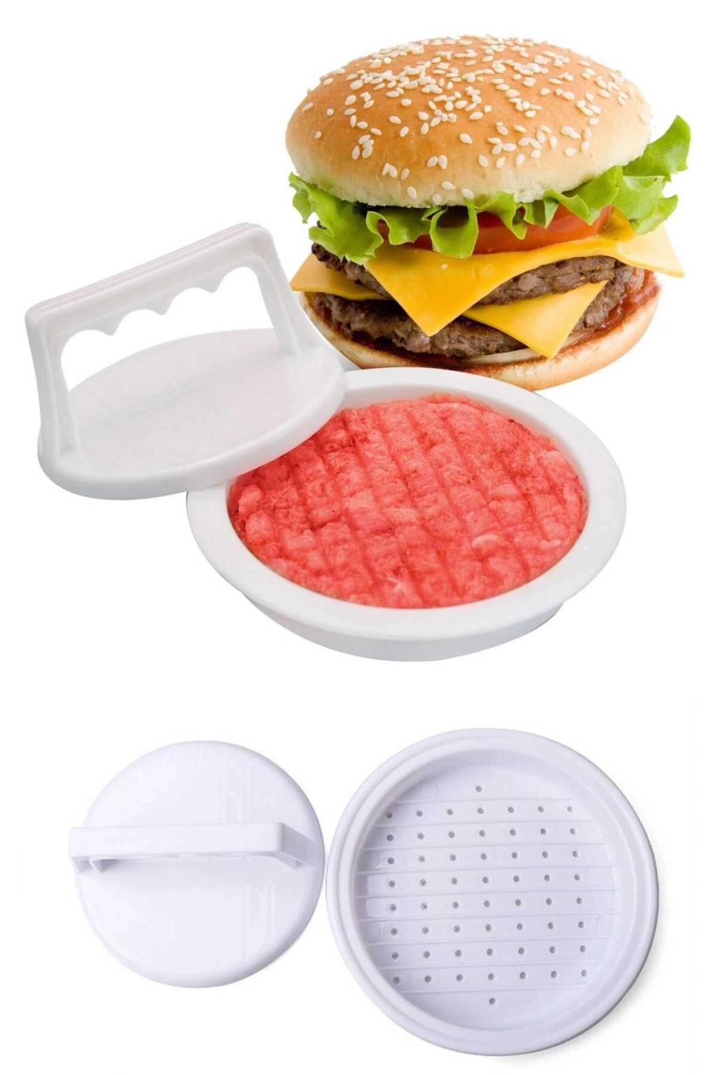 Bu aparat sayesinde evinizde restaurant kalitesinde hamburger ve köfte yapabilirsiniz. İçerisindeki çıkıntılar köfteye ızgara şekli vermenizi sağlar. Köfte harcınızı içine doldurun ve kapak kısmı ile aşağıya doğru bastırın. Kulp kısmı sağlam ve tutuşu rahattır.