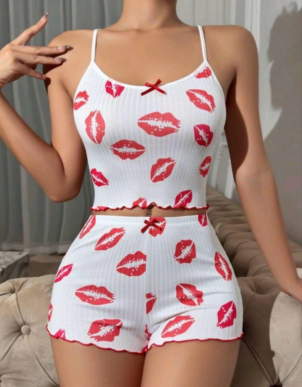 Beyaz dudak desenli bu gecelik takımı, eğlenceli ve dikkat çekici bir tasarıma sahiptir. Hafif kumaşı ile rahat kullanım sunarken enerjik bir stil yaratır.