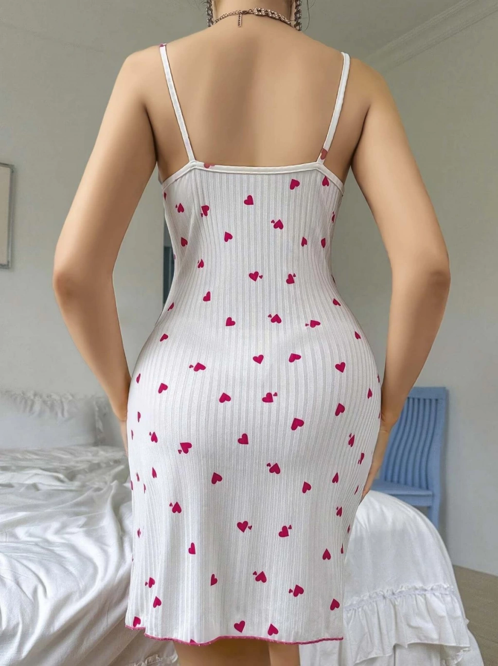 Kadın Beyaz Kırmızı Kalp Desenli Yandan Dantel Detaylı Askılı Elbise 5070