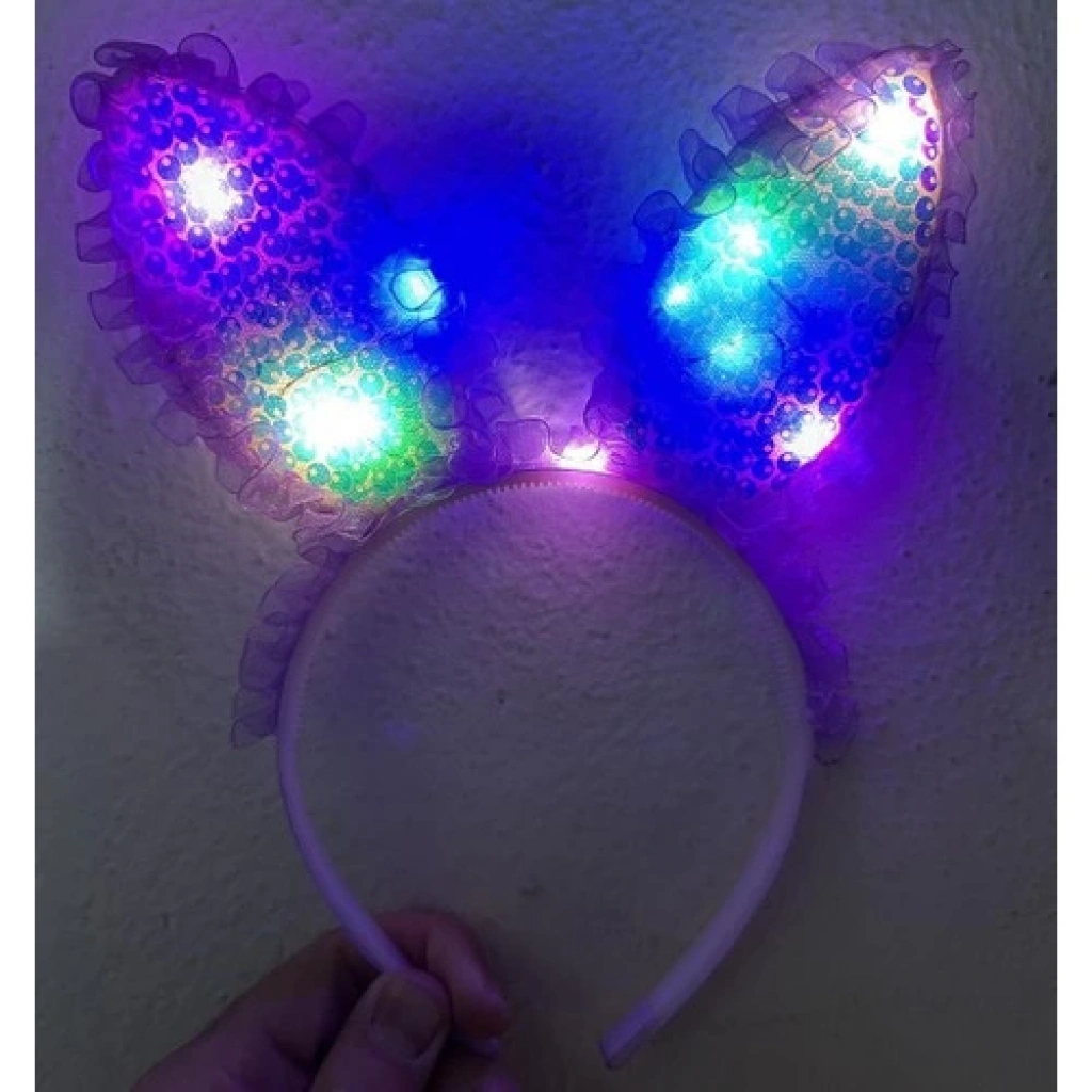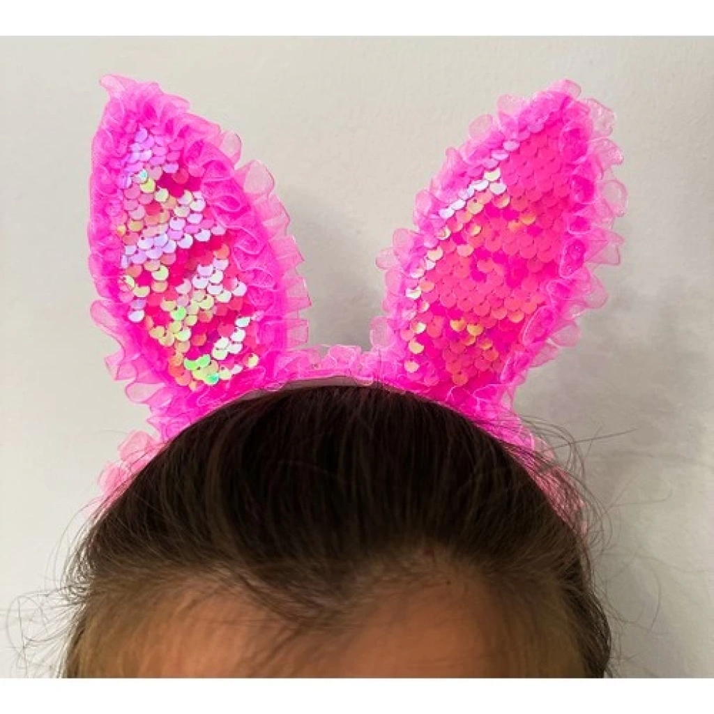 Kenarları Dantelli Fuşya Pullu Payetli LED Işıklı Tavşan Kulak Taç 23X19 cm