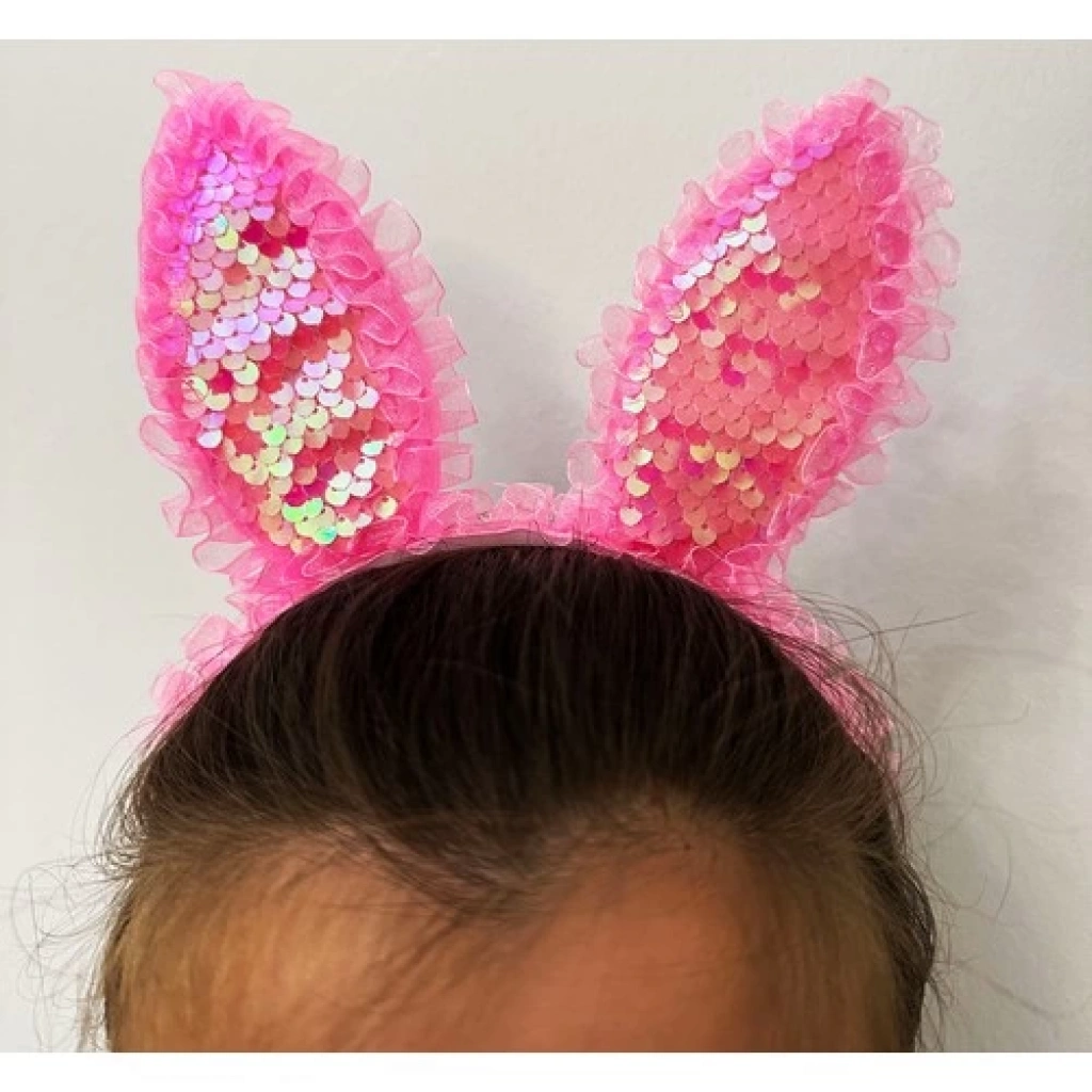 Kenarları Dantelli Pembe Pullu Payetli LED Işıklı Tavşan Kulak Taç 23X19 cm