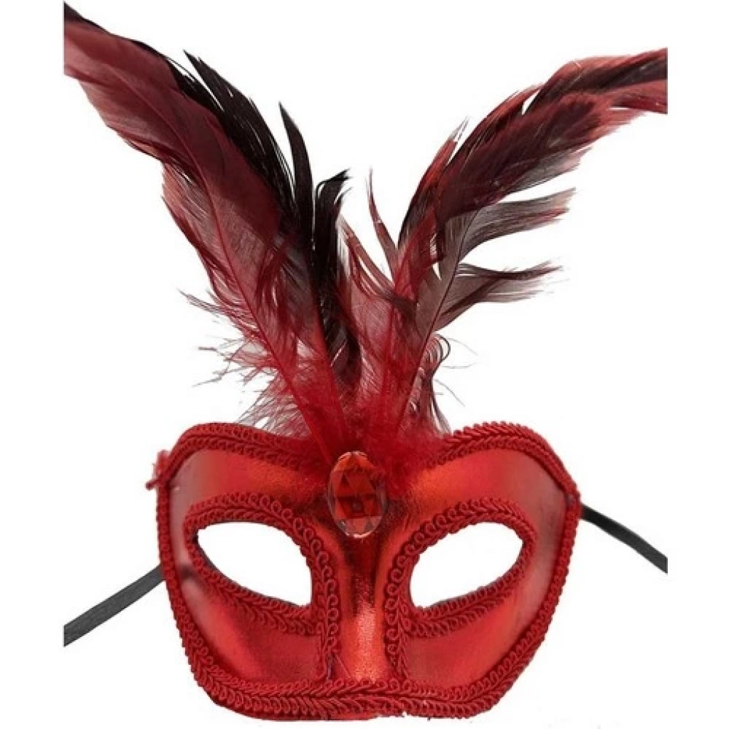 Kırmızı Renk Rugan Kaplama Kırmızı Tüylü Parti Maskesi 18X20 cm