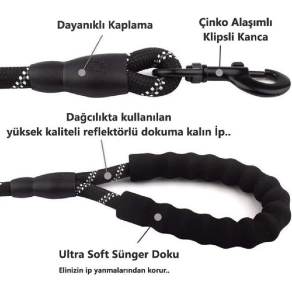 Köpekler Için Gezdirme Tasması Reflektörlü 130 cm Halat Orta ve Büyük Boy Köpekler Için Siyah