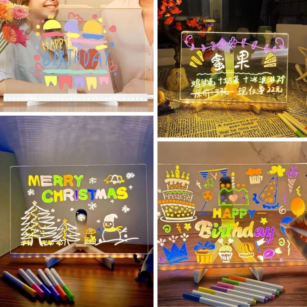 Işıltılı notlar, yaratıcı mesajlar ve eğlenceli çizimler için ideal! LED Işıklı Yazı Panosu, 20x30 cm’lik dikdörtgen formu ve renkli fosforlu kalemiyle ev, ofis ve çocuk odaları için hem pratik hem dekoratif bir çözüm sunar. LED ışık desteğiyle yazılarınız gece bile canlı ve dikkat çekici olur.