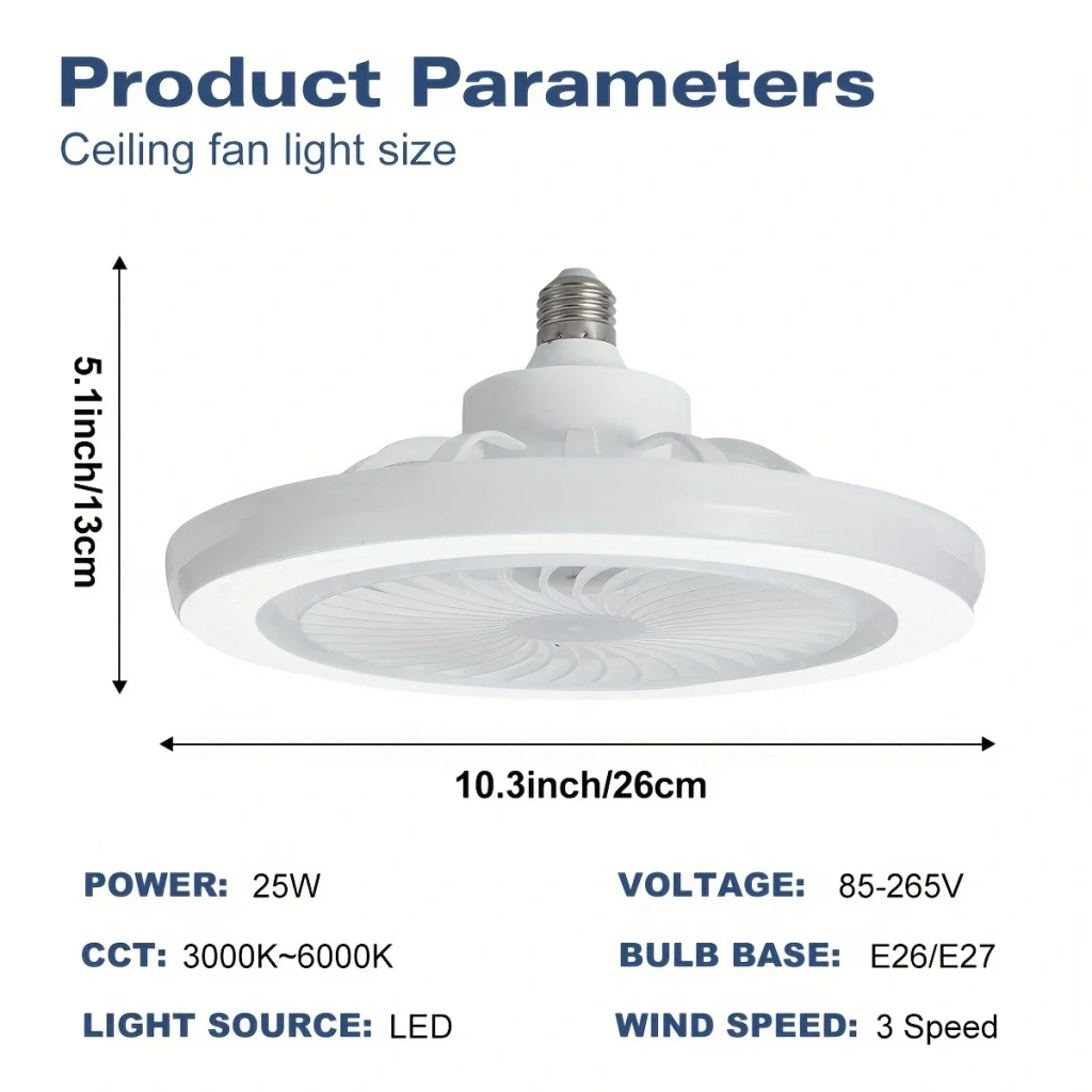 Fanlı Tavan Işığı, Lambalı 36W Tavan Vantilatörü, 9.5" Küçük Gürültüsüz E27 Oturma Odası Yemek Odası Yatak Odası Ofis için LED Fan Lambası 86-265V Beyaz