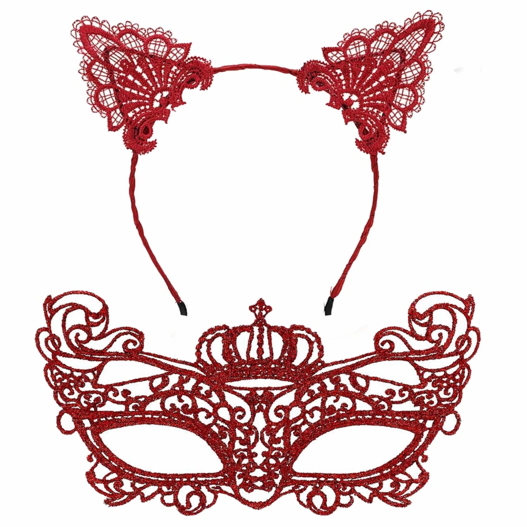 Lüks Kırmızı Dantel Taçlı Maske Seti 2 No - Parti, Balo, Kostüm Aksesuarı (5148)