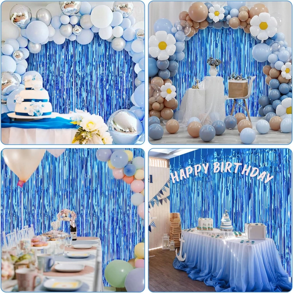 Mavi renk ekstra metalize parlak saçaklı arka fon perdesi ile özel günlerinize ve kutlamalarınıza göz kamaştırıcı bir ışıltı katın! İthal A kalite malzemeden üretilen bu perde, 1x2 metre boyutuyla her türlü dekorasyona uyum sağlar.