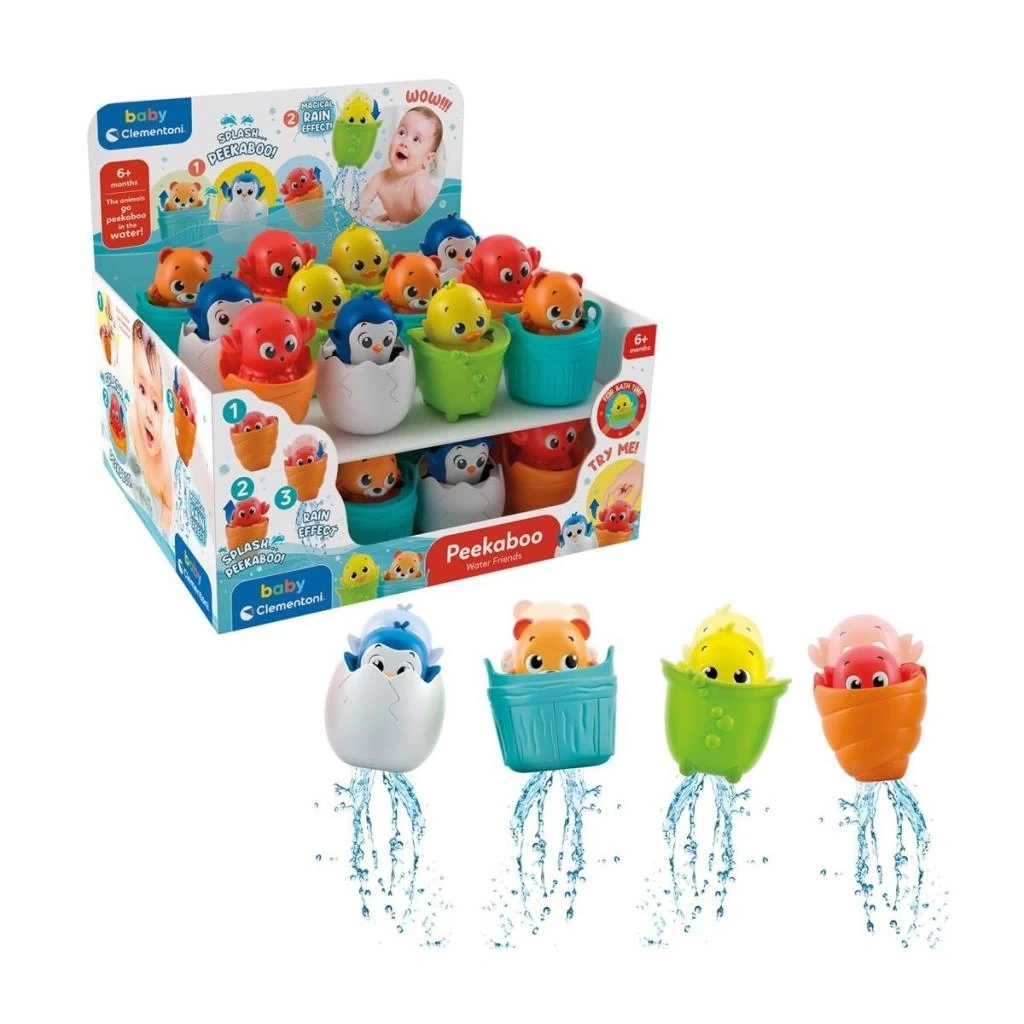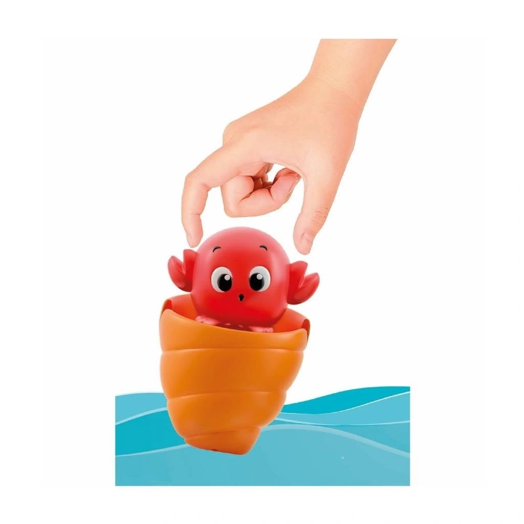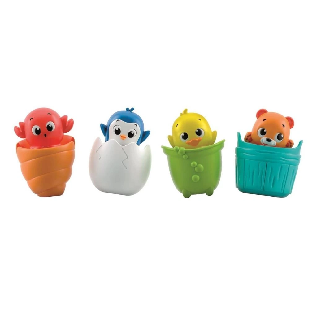 Bu sevimli hayvanlar suya batırıldığında birden bire görünür hale geliyorlar: yengeç kabuğundan, penguen de yumurtasından çıkıyor ve ördek ile ayı küvetin ve sepetin içinde ayağa kalkıyor. Bebeğiniz bunları sudan çıkardığında güzel bir fıskiye etkisiyle boşalıyorlar ve sevimli yaratıklar... tekrar “inlerine” gizleniyorlar.