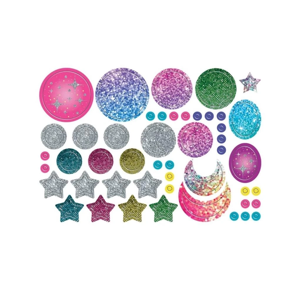 Setin içeriği: alüminyum kolyeler ve yüzükler, metalik ve renkli plastikten yapılmış, ay ve yıldız biçimlerinde uçlar, holografik çıkartmalar ve bir takı standı.