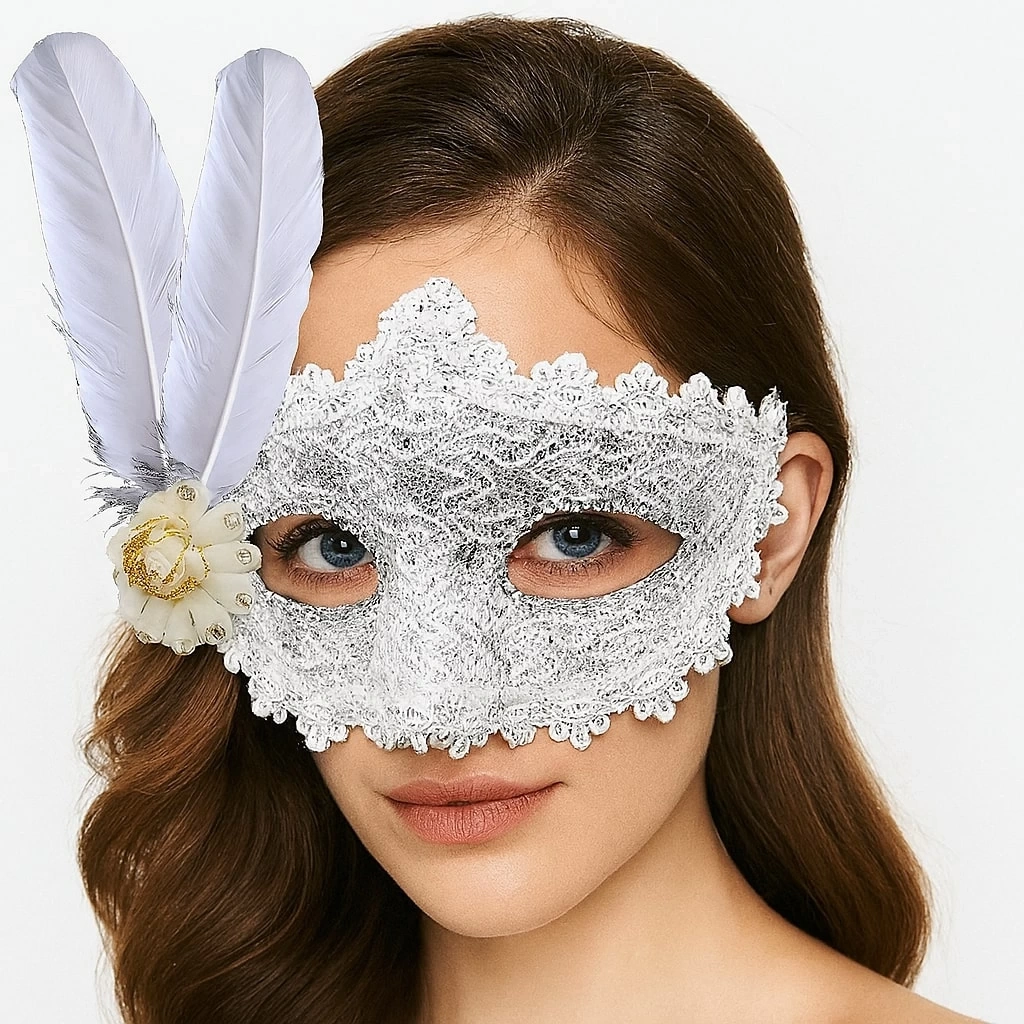 Beyaz, her zaman asil ve sofistike bir renk olarak öne çıkar. Bu maskede, klasik siyahın zarafeti, tüylü detaylarla hareket kazanır. Göz çevresini saran dantel, şıklığına şıklık katarken, taşlarla bezenmiş bölümler, maskenize ışıltı ve parlaklık ekler.