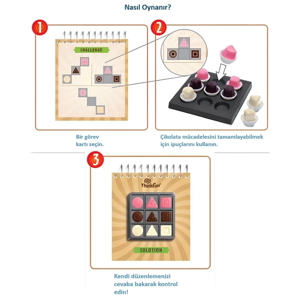 İpuçlarını kullanarak tepsiye dokuz çikolata parçasının tamamını doğru konumlarına yerleştirin. Sudoku'ya benzer şekilde, harekete geçmeden önce meydan kartındaki tüm ipuçlarını incelemelisiniz. Bu eğlenceli mantık oyununda her bir mücadeleyi tamamladığınızda güveninizin arttığını hissedeceksiniz.