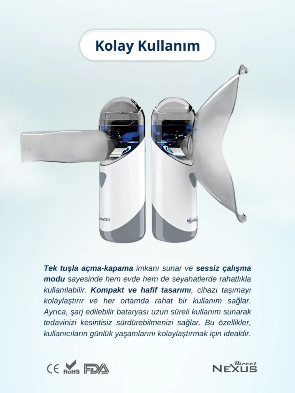 Taşınabilir Nebulizatör özellikte olan ürün ayrıca kısa sürede pratik şarj edilme özelliğine de sahiptir!