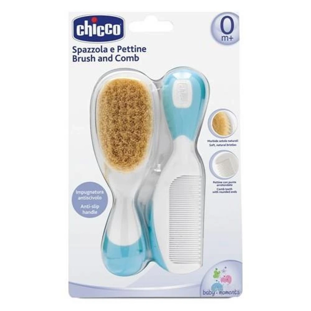 Chicco'nun fırça ve tarak serisi, hem doğal kıllı fırça hem de bebeğin saçını nazikçe taramanıza izin veren yuvarlak uçlu tarak içerir.