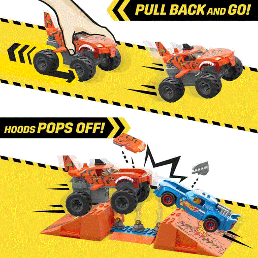 Hayranların çok sevdiği modelden ilham alan, 226 parçalı MEGA Hot Wheels Smash N Crash Tiger Shark Çarpışma Pisti yapı seti Çarpışma ve heyecan dolu maceralar için çekme ve fırlatma özelliğini kullanın. Kaput, çarpma etkisiyle fırlar!