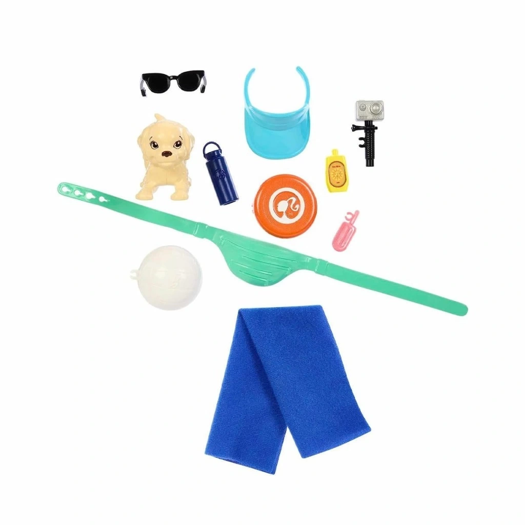 Ken bebek, parmak arası terliklerle sportif bir yüzme kıyafeti giyiyor ve oyuncu bir evcil köpek yavrusu ile geliyor.