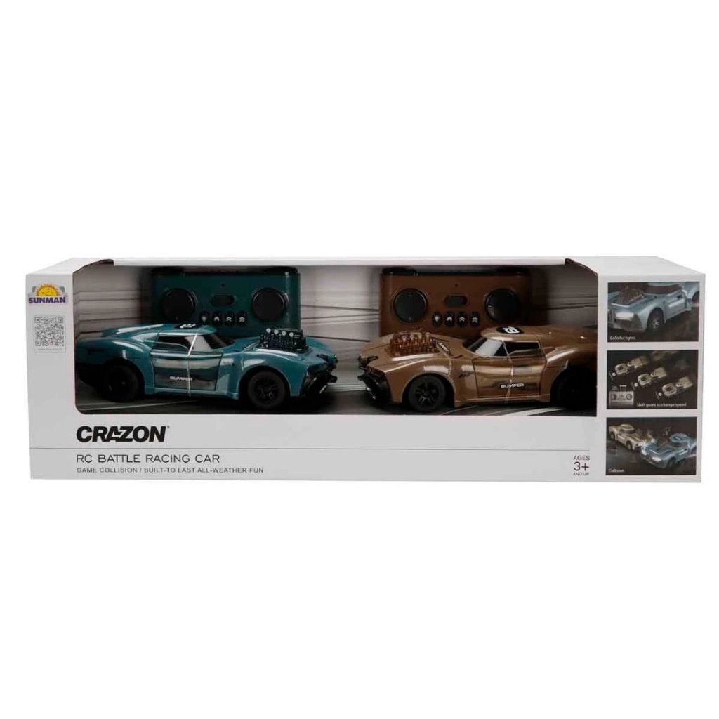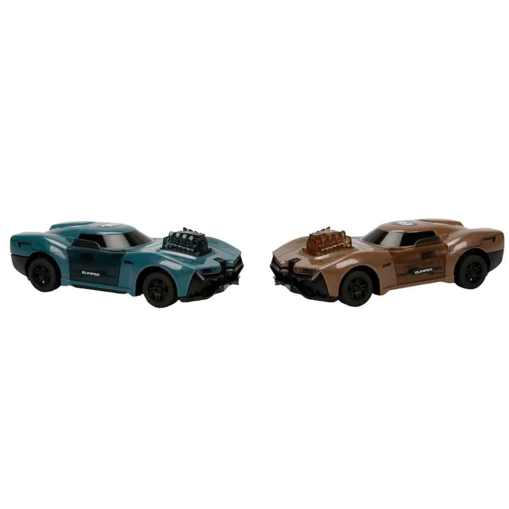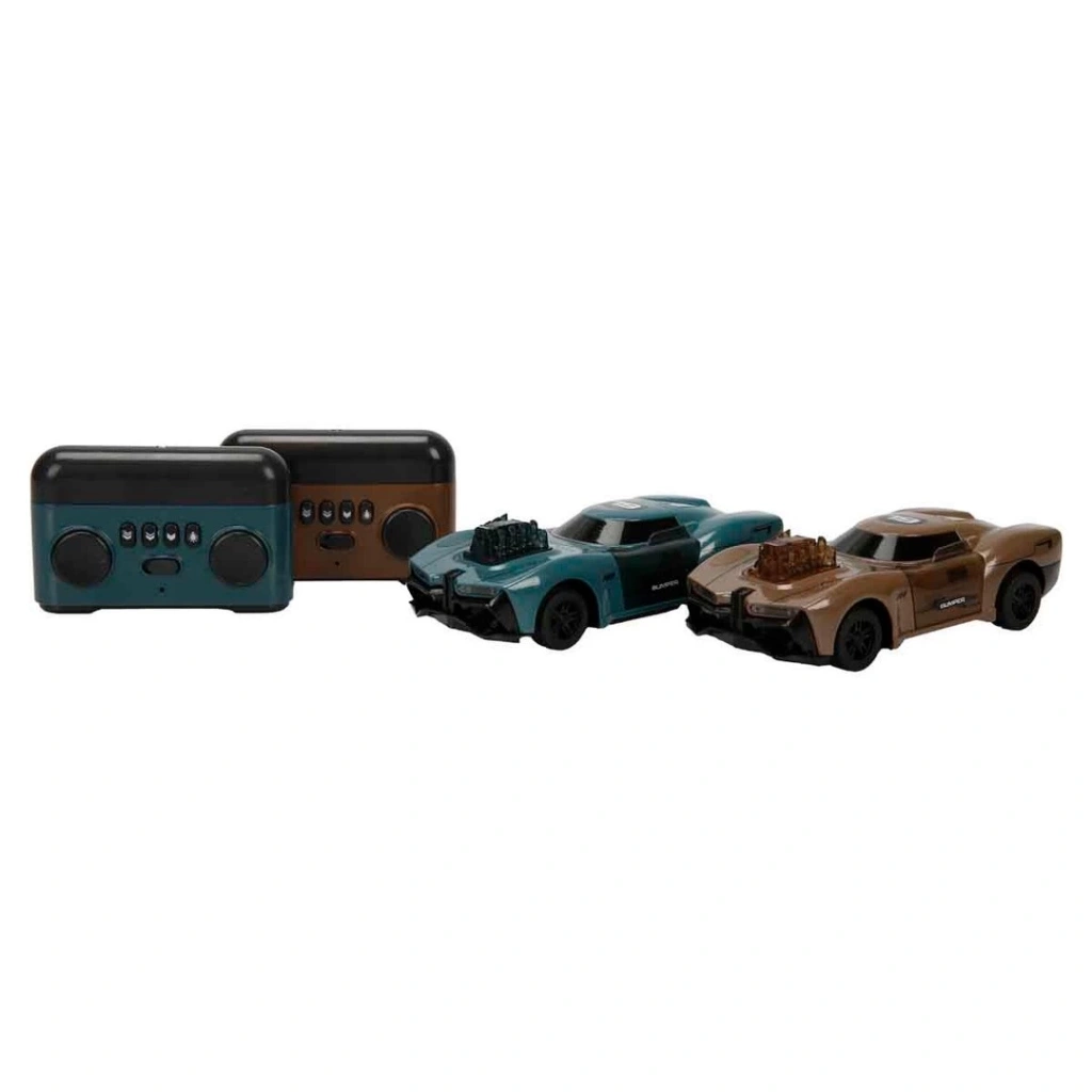 Kutudan çıkan iki farklı yarış arabası, 2.4GHz frekans teknolojisi sayesinde aynı anda kullanılabilir ve bu sayede arkadaşlar ya