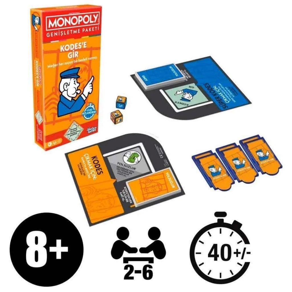 Meğer her suçun bir bedeli varmış! Monopoly Kodes'e Gir Genişletme Paketi ile Monopoly oyununa yepyeni bir soluk geliyor ve oynamak neredeyse iki kat daha kısa sürüyor. Kodes ve Kodes'e Gir hanelerini istenilen yere dönüştürmek için genişletme paketini klasik Monopoly oyun alanına ekleyebilirsiniz. Bu esnada oyuncular, kötülük yapmalarını ve diğer oyunculara karşı avantaj elde etmelerini sağlayan Yolsuzluk veya Süper Yolsuzluk kartlarını toplayabilirler! Tüm mülkler elde edildiğinde veya bir oyuncu iflas ettiğinde oyun sona erer. En zengin oyuncu oyunu kazanır!Ürün görselinde birden fazla renk ve çeşit olduğunda stokta bulunan ve gönderilecek olan ürün için soru sor kısmından bizimle iletişime geçebilirsiniz