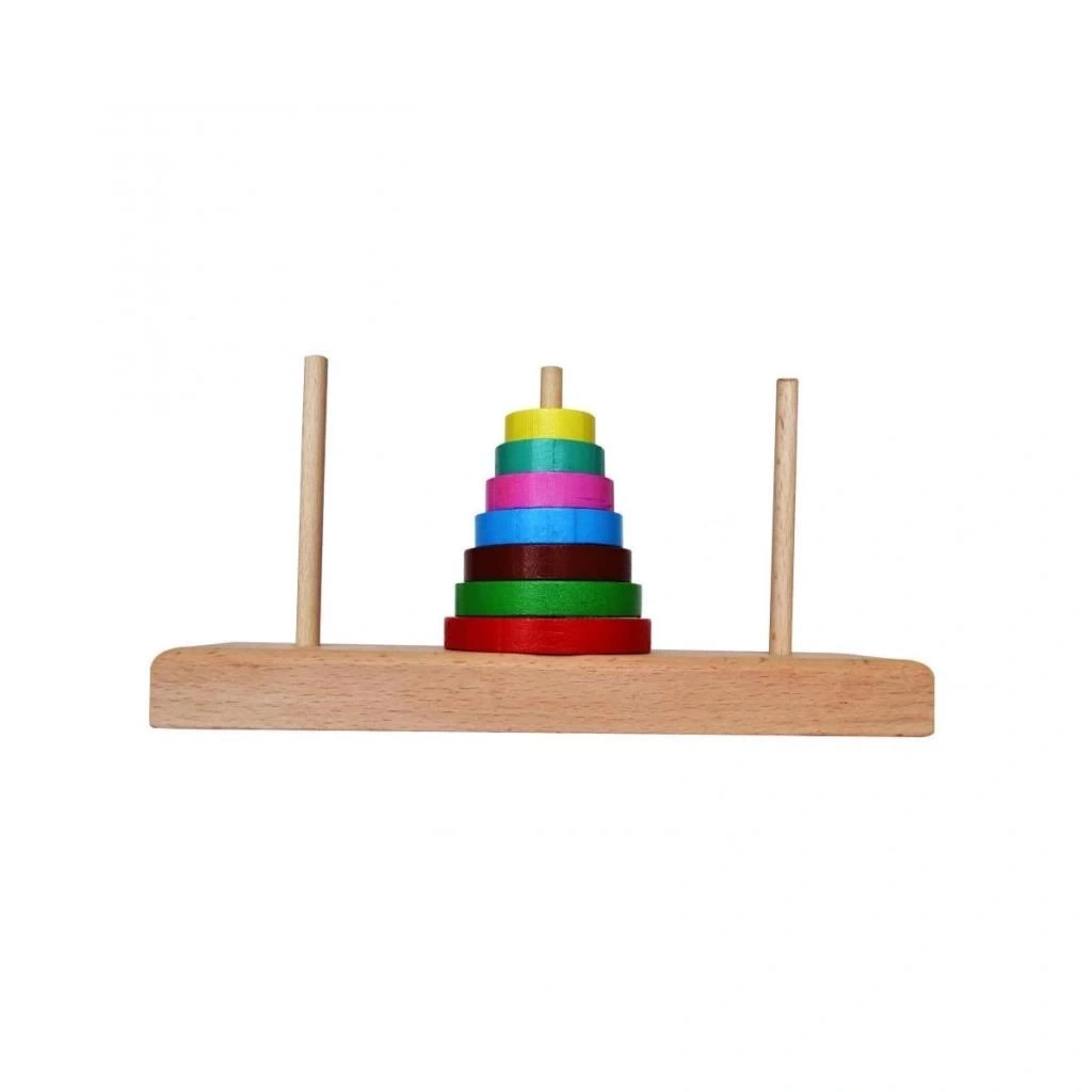 Hanoi kulelerinin amacı farklı boyutlardaki ahşap disklerden oluşan konik kuleyi, üç direğin bulunduğu oyun alanında bir diğer direğe en az hamle ile taşımaktır.