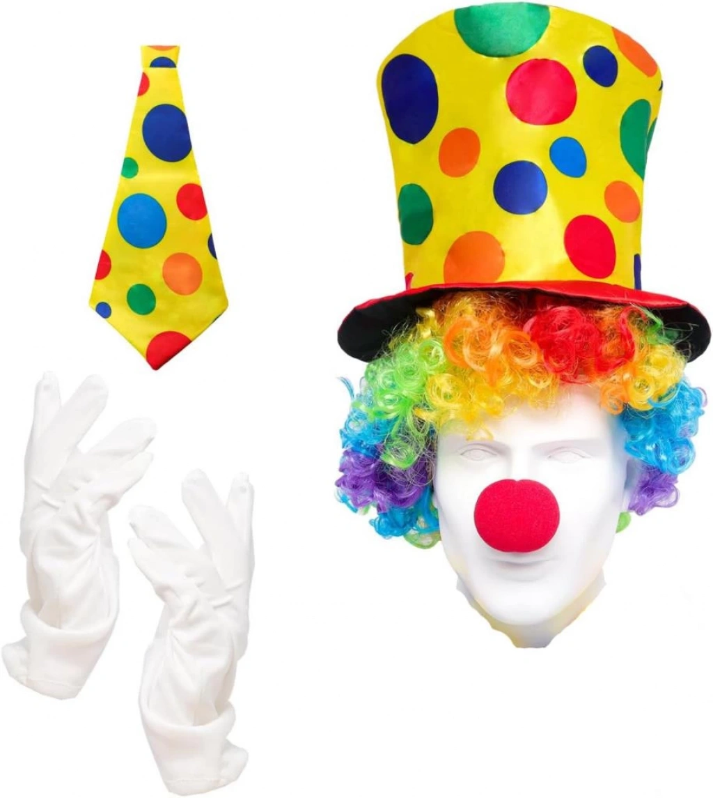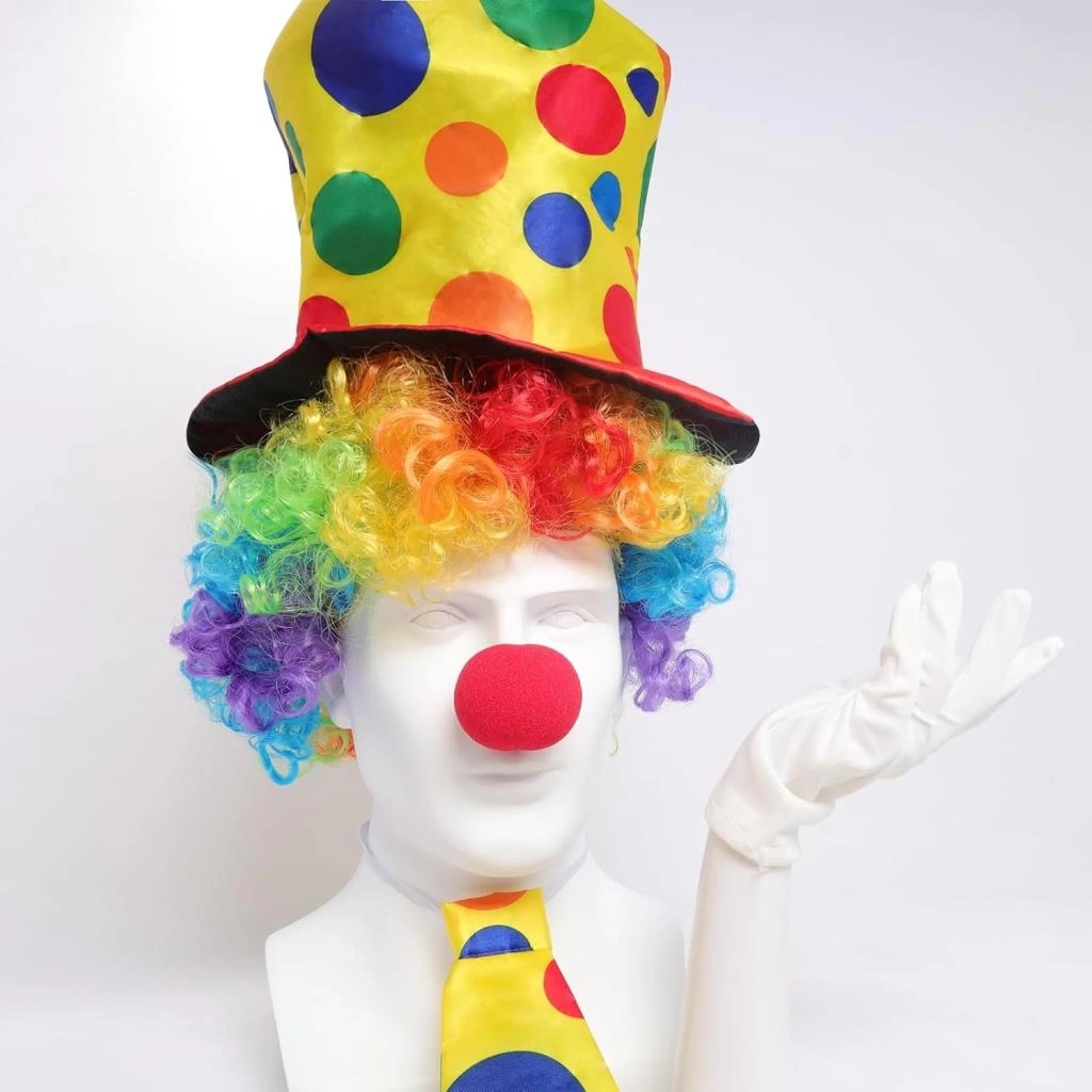 ✔ 5 Parça Tam Set: Şapka, renkli kıvırcık peruk, büyük kravat, beyaz eldiven ve sünger burun içerir.
