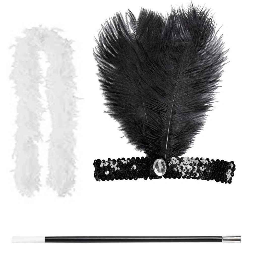 1920'ler Gatsby Kadın Aksesuar Seti – Tüylü Saç Bandı, Uzun Sigaralık ve Beyaz Otriş