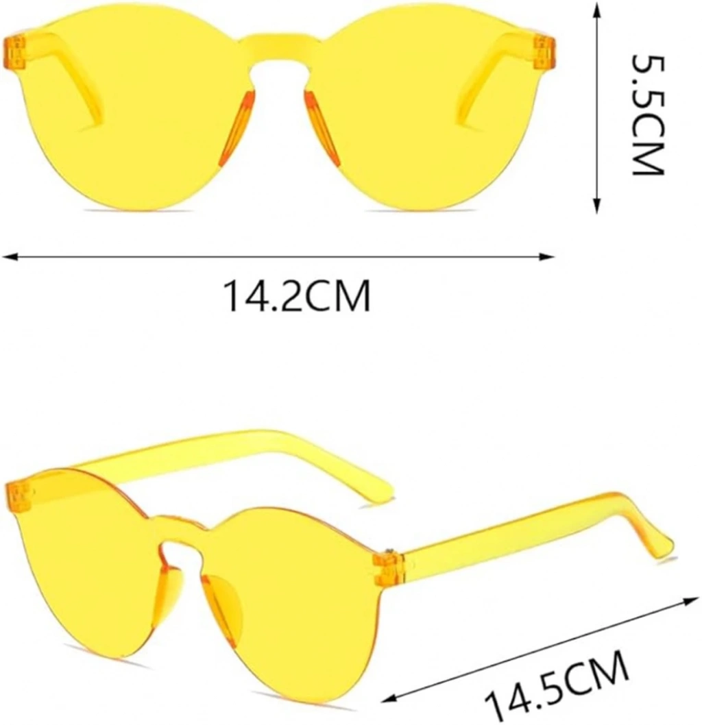 Dayanıklı sert mika malzemeden üretilen bu gözlük, 5x14 cm ölçüsüyle yüz hatlarına uyumlu olup retro ve modern tarzı bir arada sunar. Çerçevesiz tasarımıyla dikkat çekici bir aksesuar olan sarı şeffaf lens, enerji dolu ve iddialı bir stil yaratmak için idealdir.