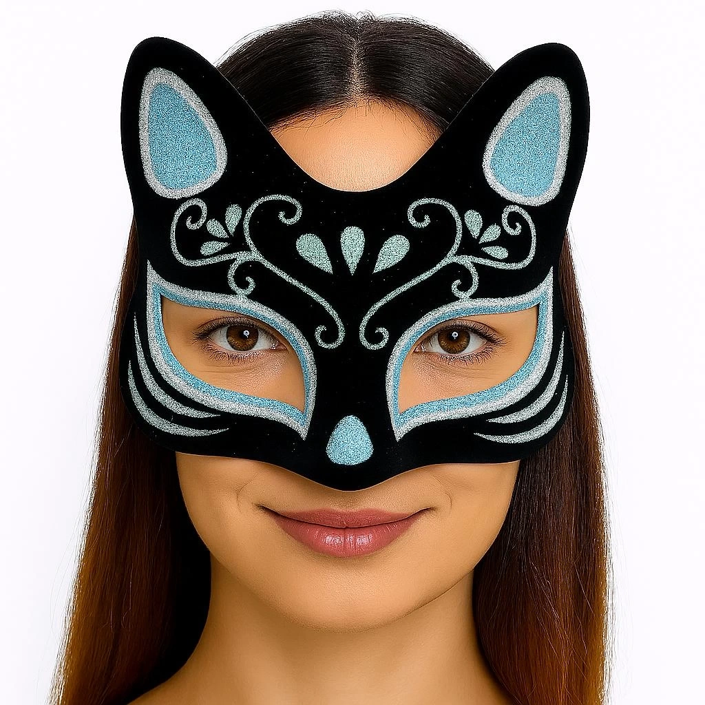 Siyah Renk Üzeri Gümüş Mavi Simli Süet Kaplama Kedi Maskesi ile gizemli ve etkileyici bir görünüm oluşturun ve Kostüm Partisine hazır olun!