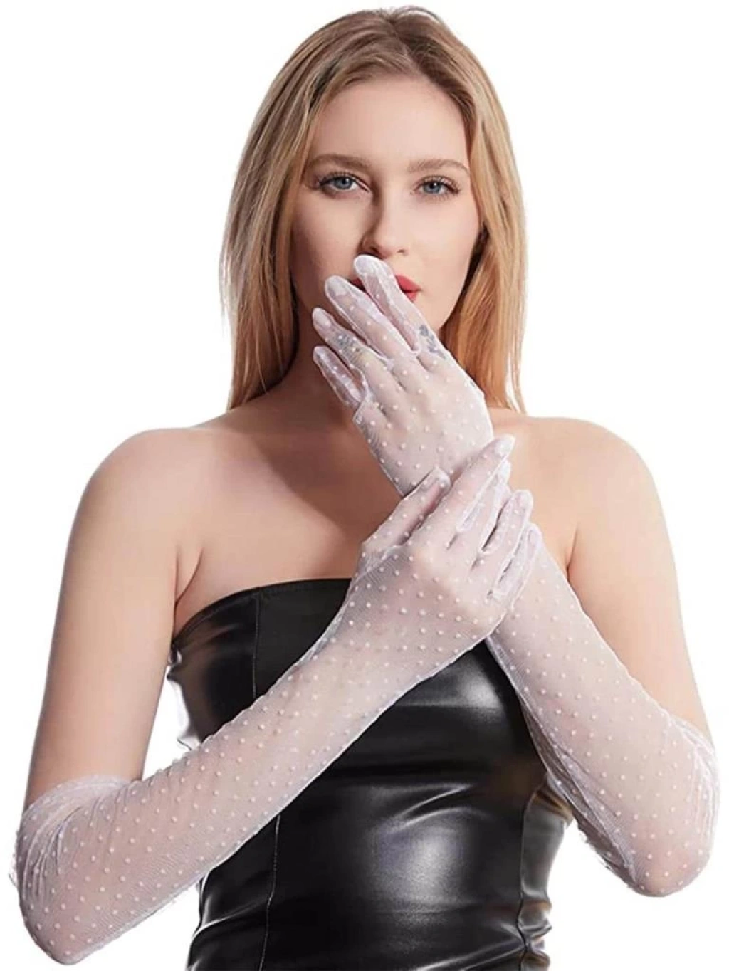 Uzun Boy Beyaz Puantiyeli Beyaz Renk Tül Eldiven