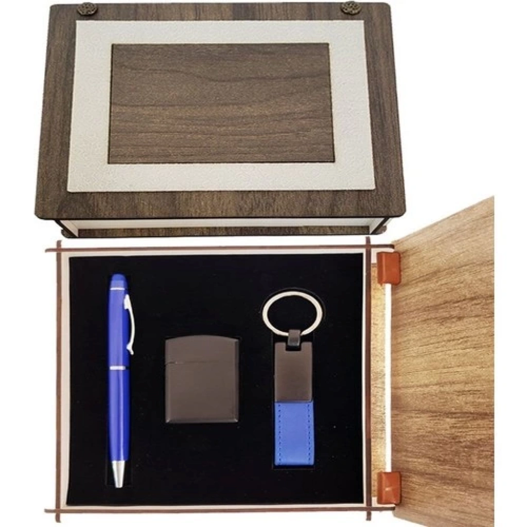 Özel Ahşap Kutulu Lacivert Kalem Anahtarlık ve Çakmak Set