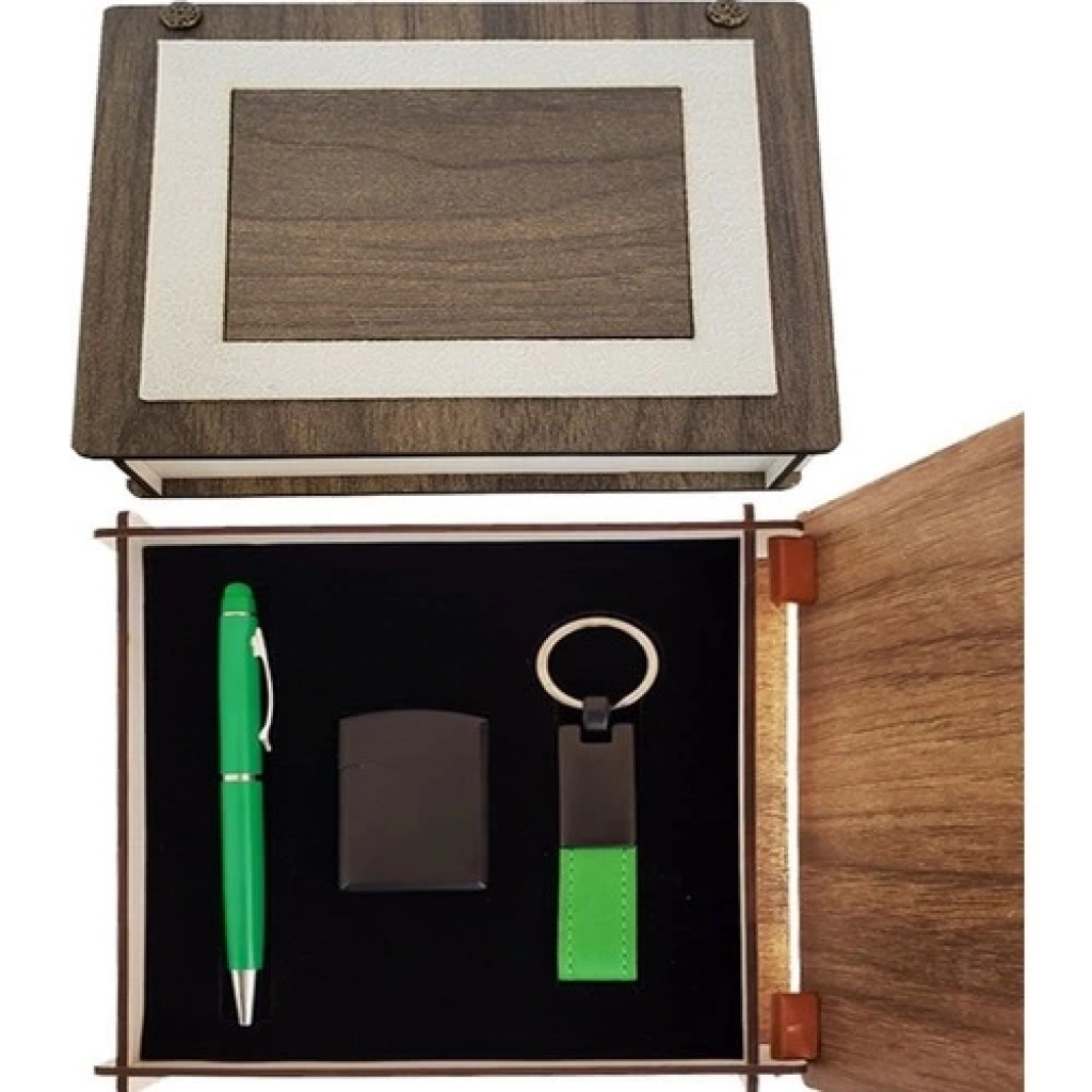 Ahşap Kutulu Yeşil Kalem Anahtarlık ve Çakmak Seti