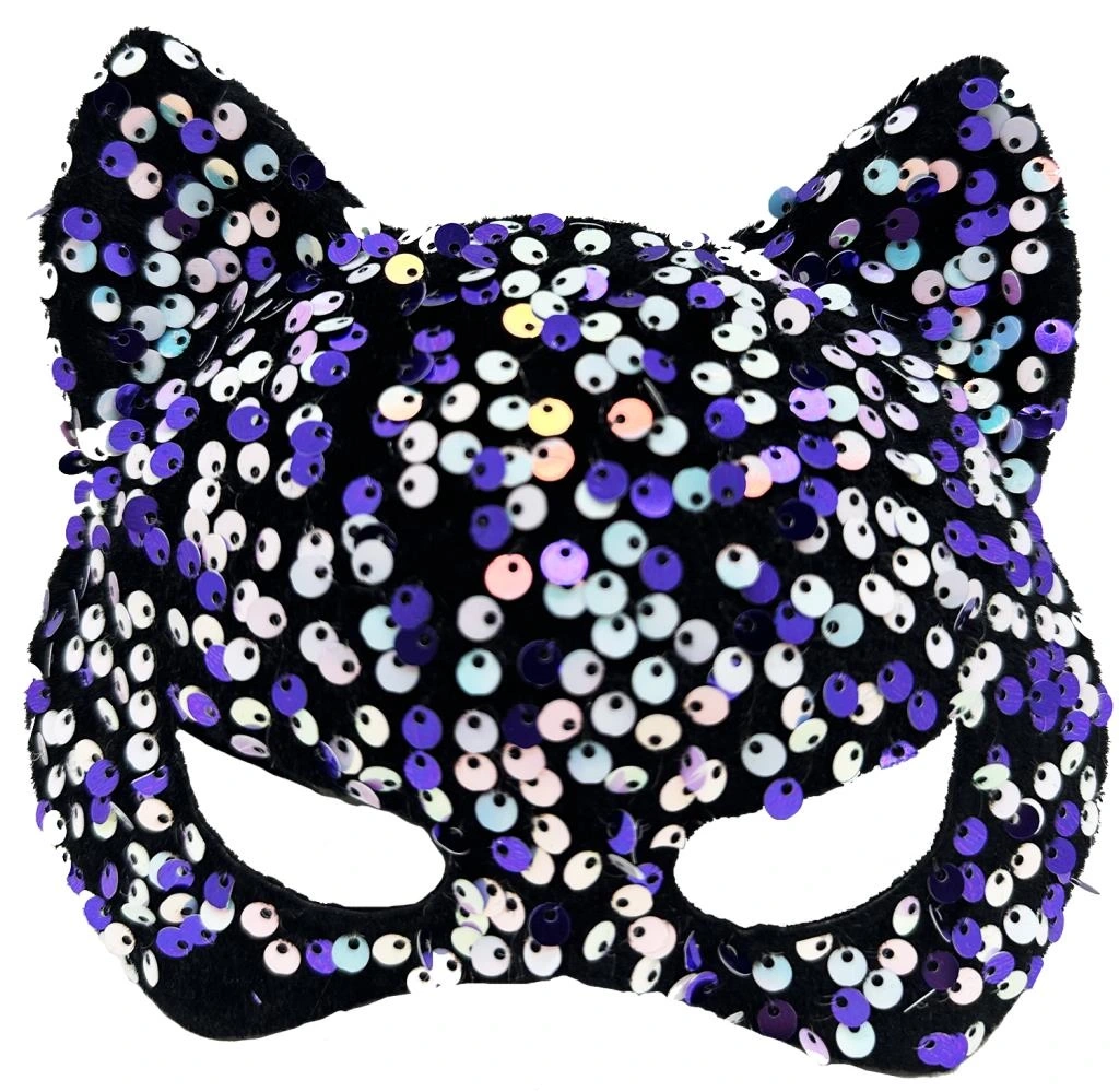 Siyah Kadife Kumaş Üzerine Mor Beyaz Payetli Pullu Parti Maskesi 16x14 cm