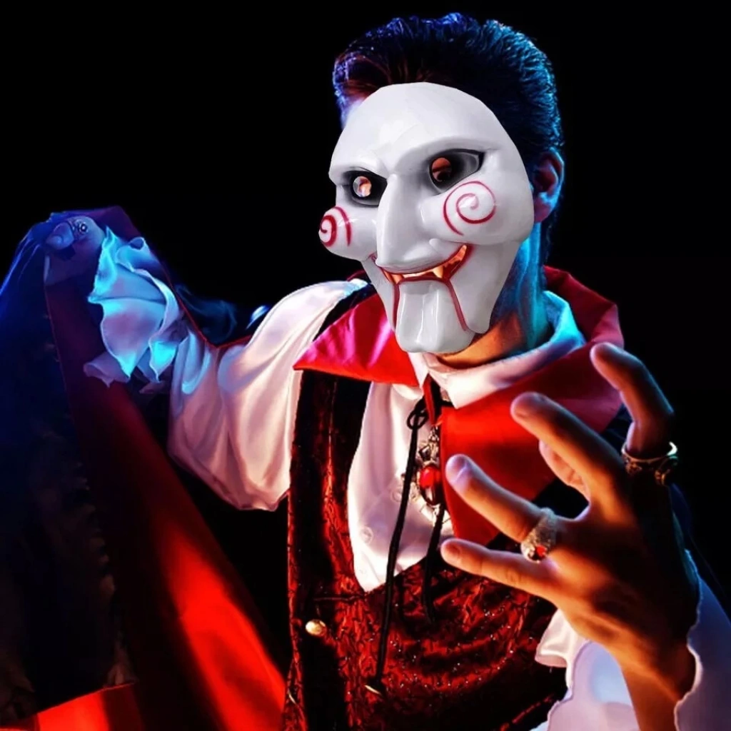 Yetişkinler ve Çocuklar için Parçalı maske siyah elastik sert plastik ve yapışması yapılmıştır. Siyah göz bölgesi, kırmızı ağız bölgesi ve yanaklarda kırmızı spirallerle beyazdır. Bu testere maskesi bir kukla kafasına benziyor, bir Cadılar Bayramı partisi için orijinal bir şekilde giyinmek için mükemmel .