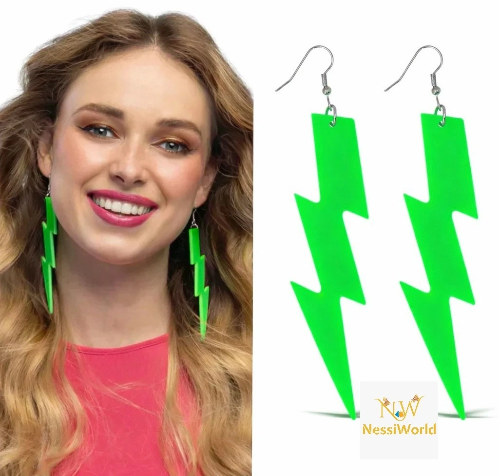 Timion 80’ler 90'lar Retro Neon Yeşil Şimşek Küpe 10 cm