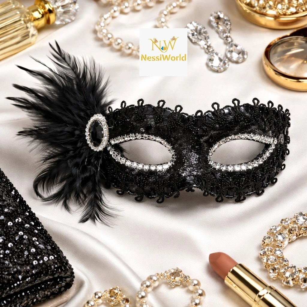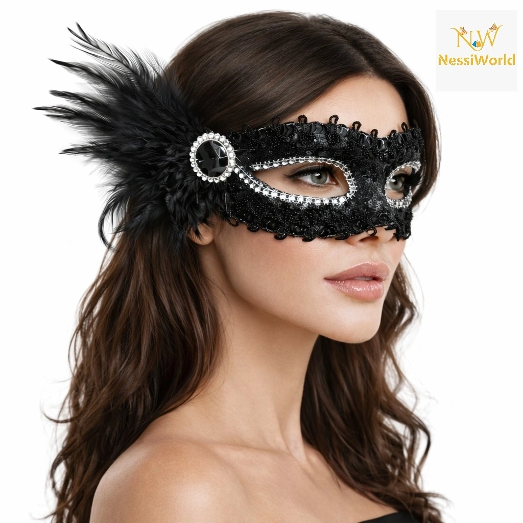 Timion Siyah Taşlı Venedik Parti Maskesi – Tüylü Payetli