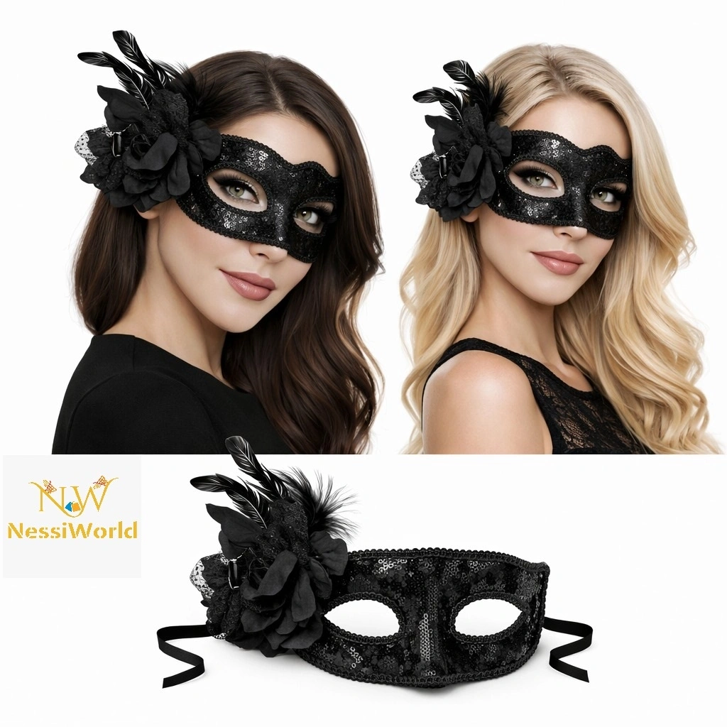 Timion Siyah Venedik Parti Maskesi – Çiçekli Tüylü Payetli