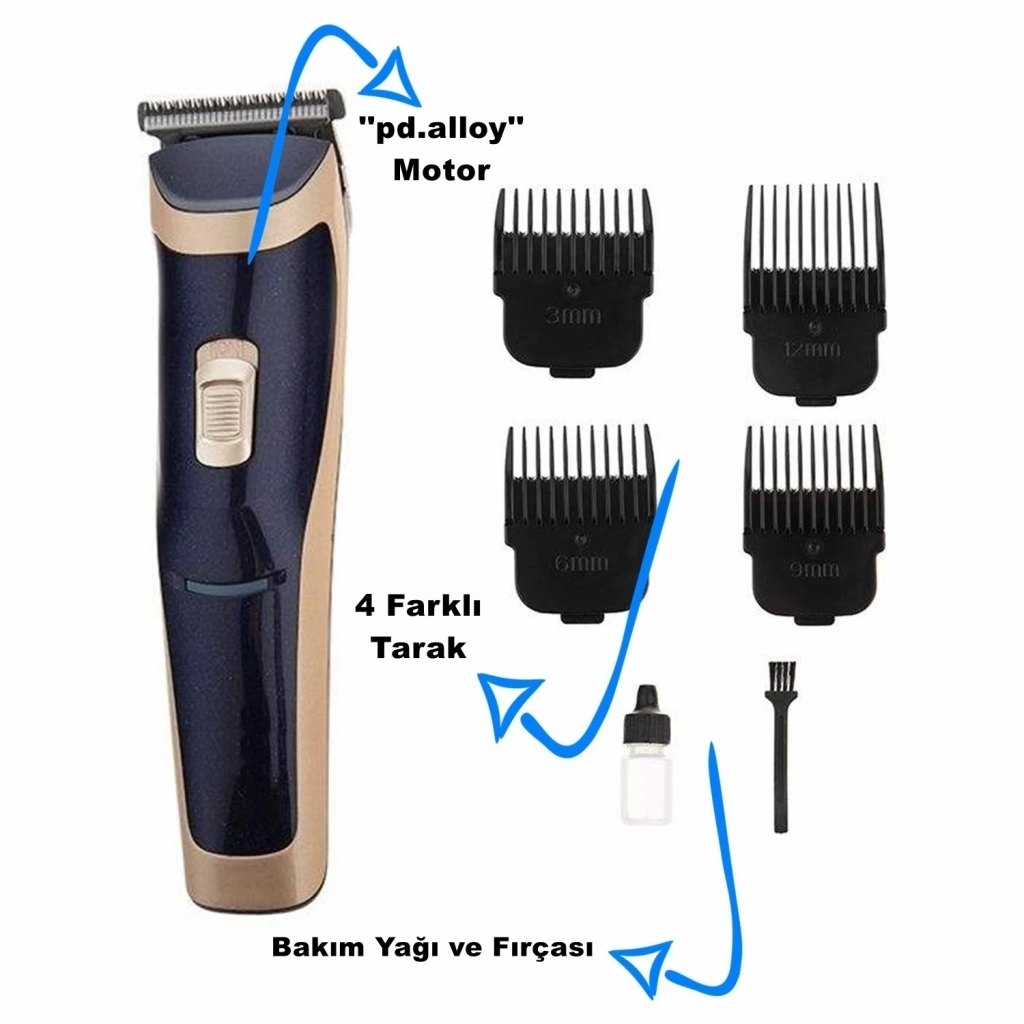 Taraklar 1 ADET 12mm 1 ADET 9mm 1 ADET 6mm 1 ADET 3mm 1 ADET ŞARJ ADAPTÖRÜ 1 ADET TEMİZLİK FIRÇASI 1 ADET BAKIM YAĞI
