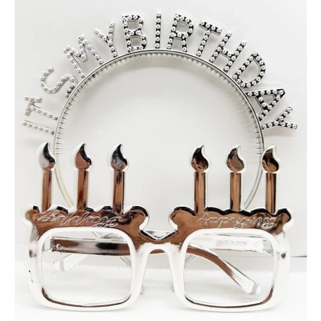 TYY It's My Birthday Yazılı Taç ve Mum Şekilli Gözlük Seti Gümüş Renk