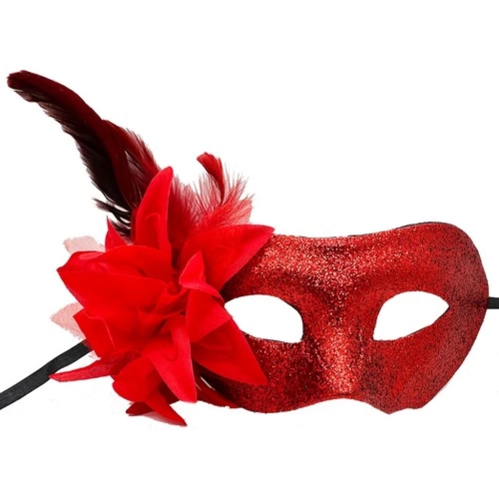 Kırmızı Mat Renk Yandan Tüylü Güllü Parti Balo Venedik Maskesi 16x22